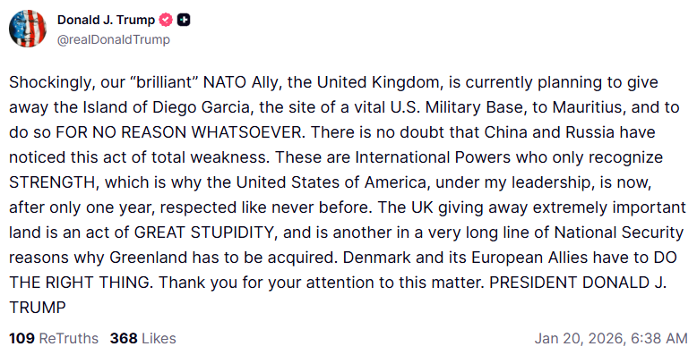 हालांकि अब ट्रंप ने अपने सोशल मीडिया प्लेटफॉर्म पर ब्रिटेन को निशाने पर लेते हुए कहा कि एक प्रमुख नाटो सहयोगी होने के बावजूद यूके डिएगो गार्सिया द्वीप को “बिना किसी ठोस कारण” मॉरीशस को सौंप रहा है. डिएगो गार्सिया पर अमेरिका और ब्रिटेन का अहम सैन्य अड्डा स्थित है. समझौते के तहत इस सैन्य अड्डे को 99 वर्षों के लिए लीज़ पर वापस लेने की व्यवस्था की गई है.