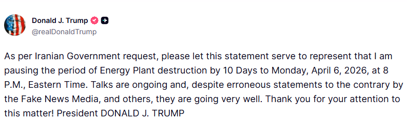 डोनाल्ड ट्रंप ने ईरान के ऊर्जा ढांचे पर संभावित हमले की अपनी चेतावनी को फिलहाल 10 दिनों के लिए टाल दिया है. उन्होंने यह कथित फैसला ईरानी सरकार के अनुरोध के बाद लिया है. पहले यह समयसीमा जल्द ही खत्म होने वाली थी, लेकिन अब इसे बढ़ाकर 6 अप्रैल तक कर दिया गया है.