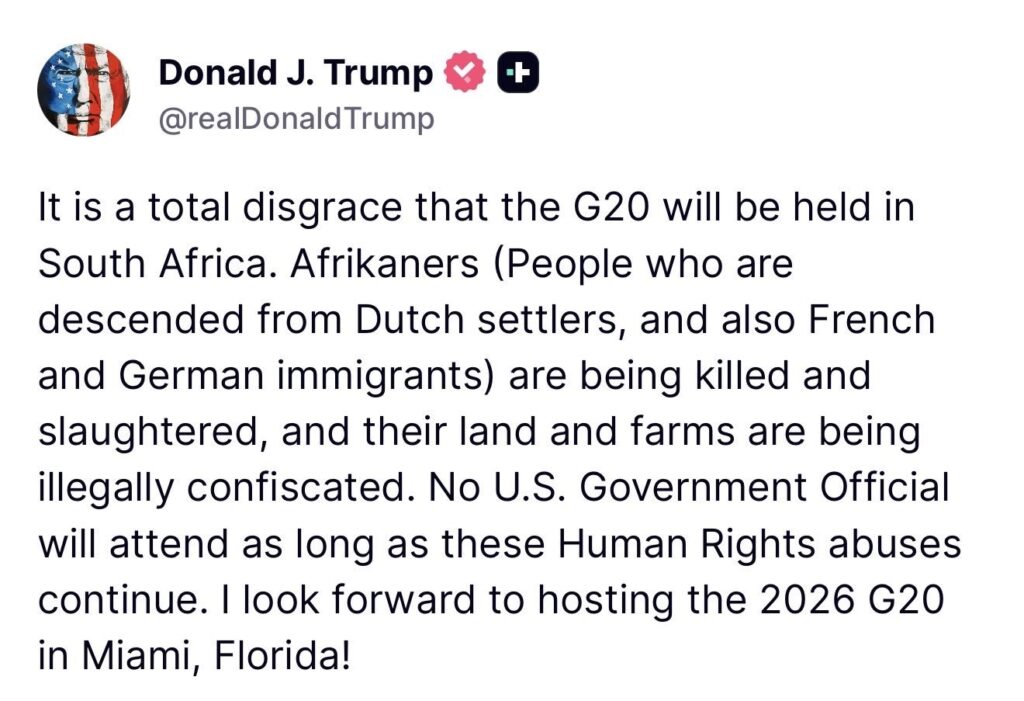 ट्रंप ने शुक्रवार को अपने सोशल मीडिया प्लेटफॉर्म Truth Social पर लिखा, “G20 का साउथ अफ्रीका में होना पूरी तरह से शर्मनाक है. अफ्रीकानर (डच, फ्रेंच और जर्मन वंशज) मारे जा रहे हैं, उनके खेत और जमीनें अवैध रूप से जब्त की जा रही हैं.”