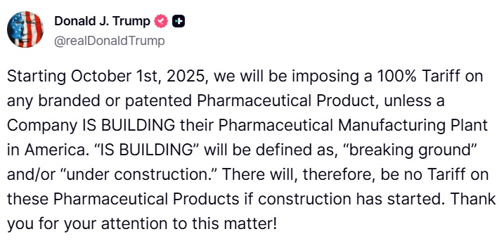 नए शुल्कों में 100% टैरिफ उन ब्रांडेड और पेटेंटेड दवाइयों पर लागू होगा, जिन्हें अमेरिका में नहीं निर्मित किया जाता. ट्रंप ने कहा कि जिन कंपनियों ने अमेरिका में उत्पादन संयंत्र स्थापित करना शुरू किया है, उन्हें इस शुल्क से छूट मिलेगी.
