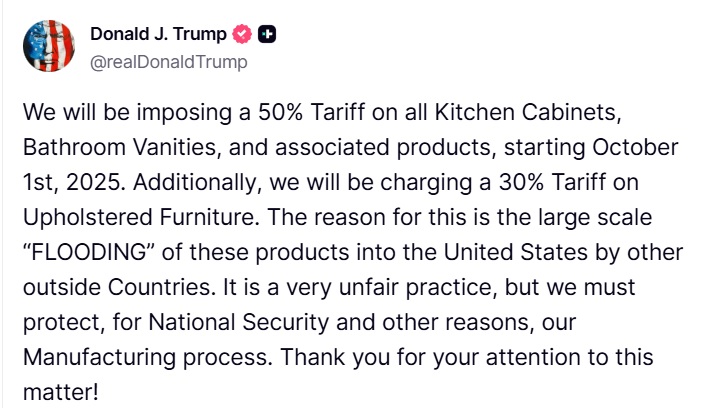 इसके अतिरिक्त, ट्रंप ने यह भी कहा कि 25% शुल्क भारी ट्रकों और 30% शुल्क अपहोल्स्टर्ड फर्नीचर पर लगाया जाएगा, जिसे उन्होंने “अन्य देशों द्वारा अमेरिकी बाज़ार में भेजे जा रहे अत्यधिक सामान” का परिणाम बताया. ये शुल्क अमेरिका में कई बड़े फर्नीचर निर्माता कंपनियों की वापसी का एक प्रयास हो सकता है, जिनका कारोबार पिछले दो दशकों में मंदी का सामना कर चुका है.