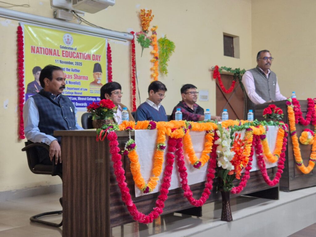 मेरठ कॉलेज मेरठ के विधि विभाग में आज दिनांक 11 नवंबर 2025 को दोपहर 12 बजे राष्ट्रीय शिक्षा दिवस बड़े हर्ष और उल्लास के साथ मनाया गया. कार्यक्रम में देश के प्रथम शिक्षा मंत्री और महान शिक्षाविद् मौलाना अबुल कलाम आज़ाद को याद किया गया.