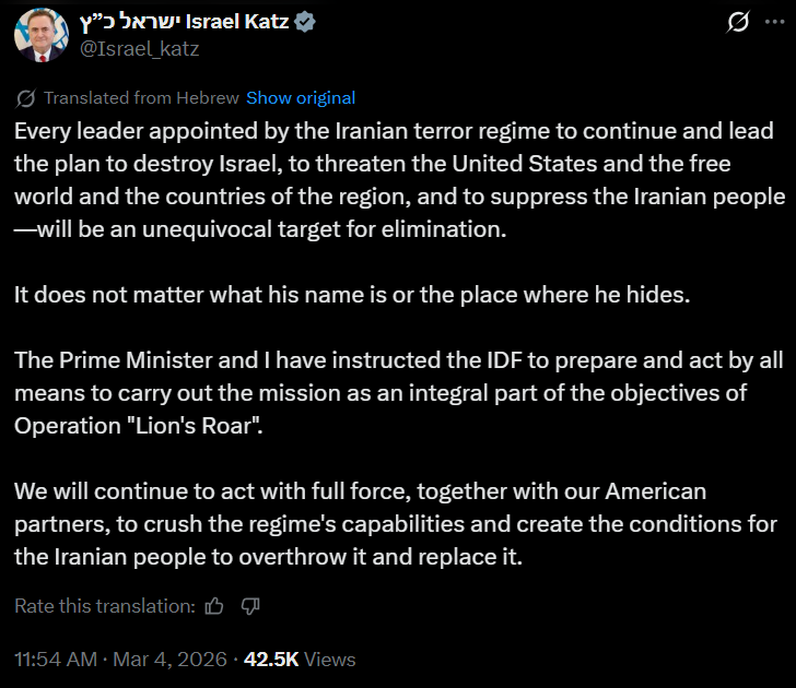 Posting on X on Wednesday (March 4, 2026), Katz declared that any leader appointed by Tehran who continues policies aimed at Israel’s destruction, threatens the United States and regional nations, or suppresses the Iranian population will be treated as “a target for elimination.”