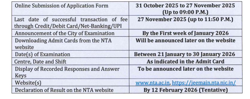 According to the official NTA notification, JEE Main 2026 Session 1 will be conducted from January 1 to January 30, 2026, while Session 2 is scheduled from April 1 to April 10, 2026.
